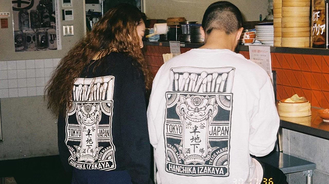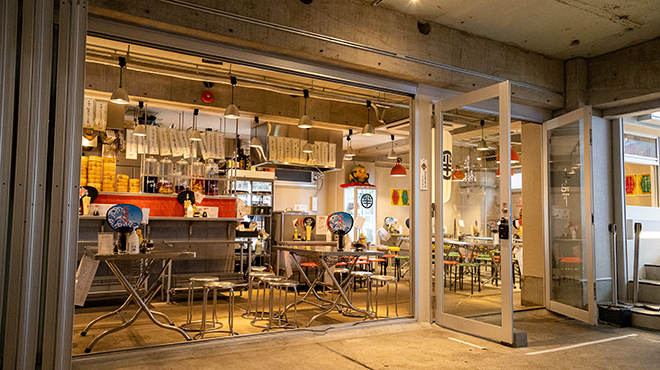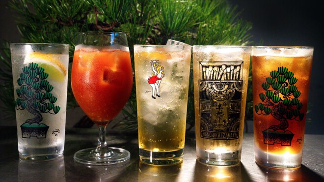 看板・提灯・食器類をはじめ、店内の装飾やグラフィックは各分野で活躍中のアーティストとコラボレートしています。現在は、庭師にして盆栽作家の濵本祐介さん、タトゥー・アーティストのLENさん、グラフィック・デザイナーの山木真さんらが参加。「EATDRINKANDDIE」と書かれたうちわや、店のロゴが描かれたグラスなど各種アイテムもあります。不定期でライブイベントも開催されるので、どうぞお見逃しなく!